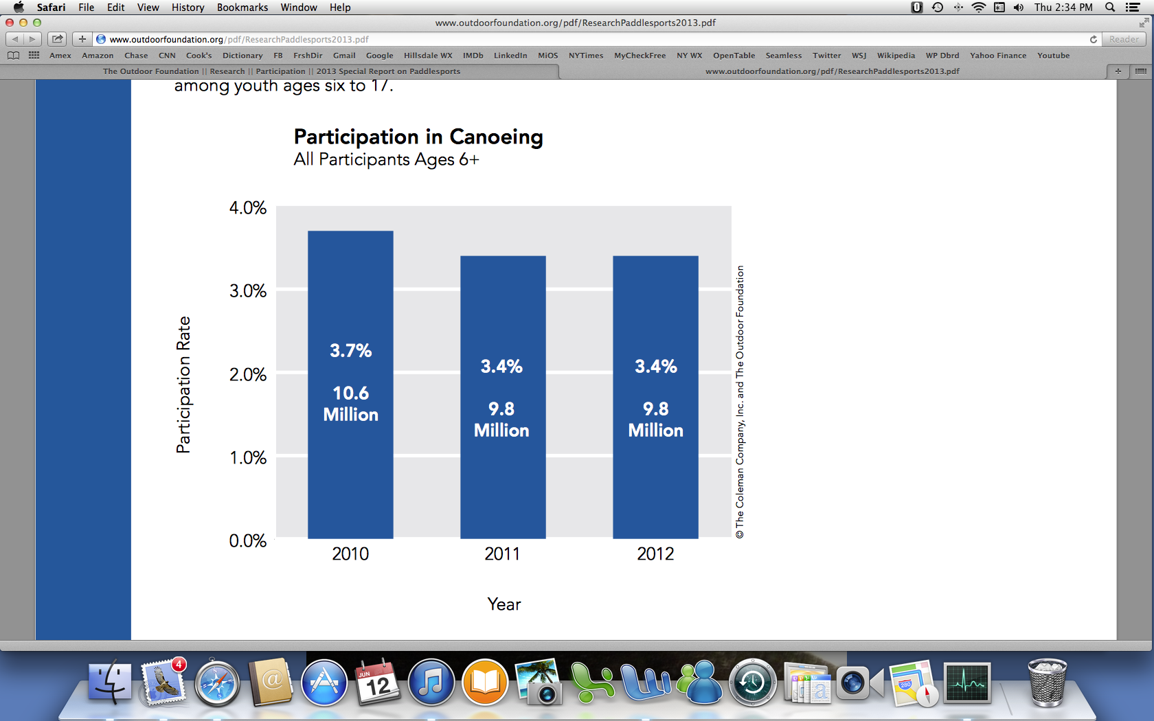 In about a tenth of a second, I had my answer: according to canoe-monger Coleman, in 2012, 9.8 million Americans took a canoe trip. (See the link below.  As you’ll see, this figure was actually based on genuine — and no doubt pricey — research by a reputable online survey firm.)